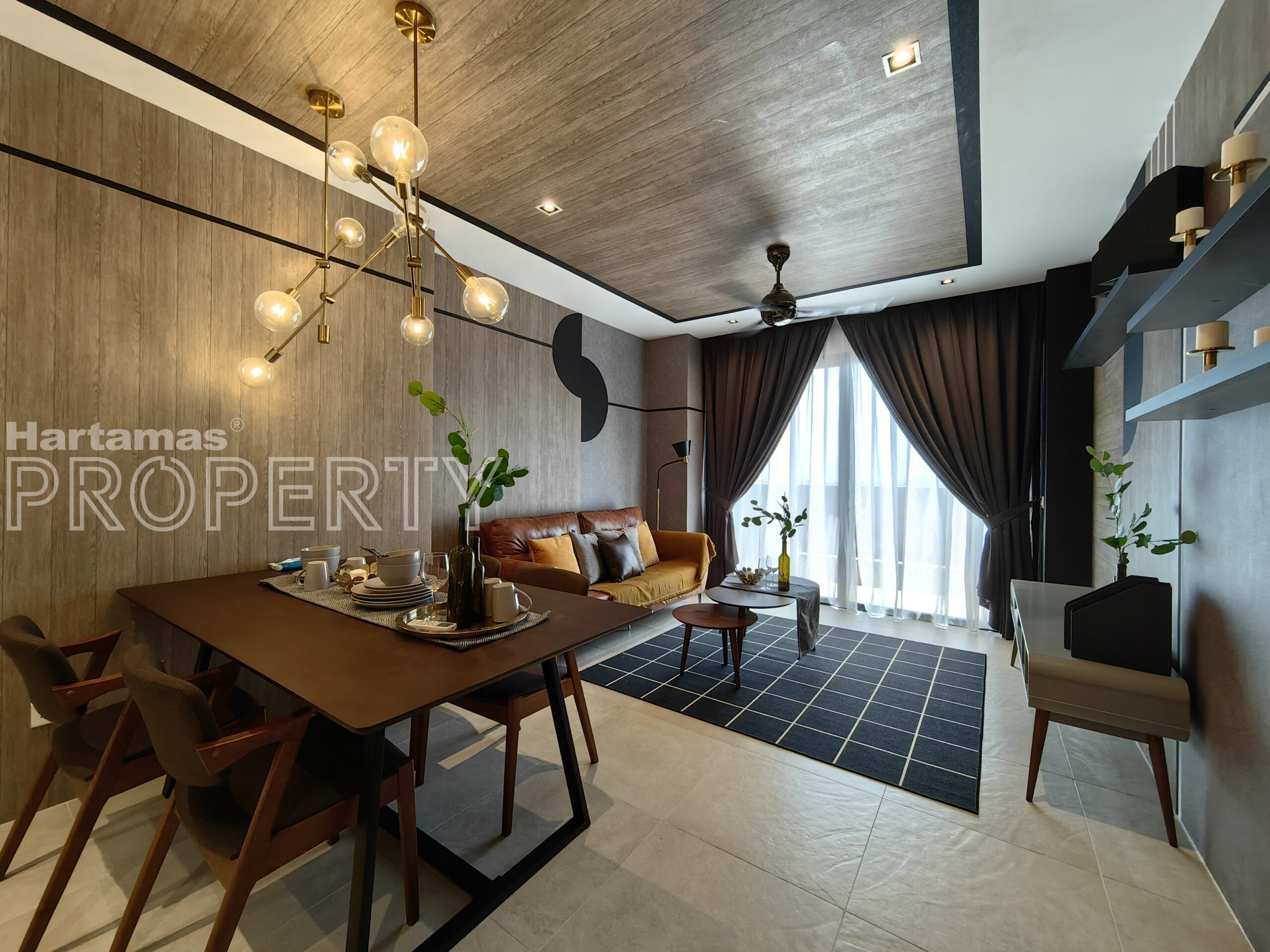 – Living Hall with Air-cond, built in tv cabinet, fan, curtain, Sofa, TV, dining table and chairs