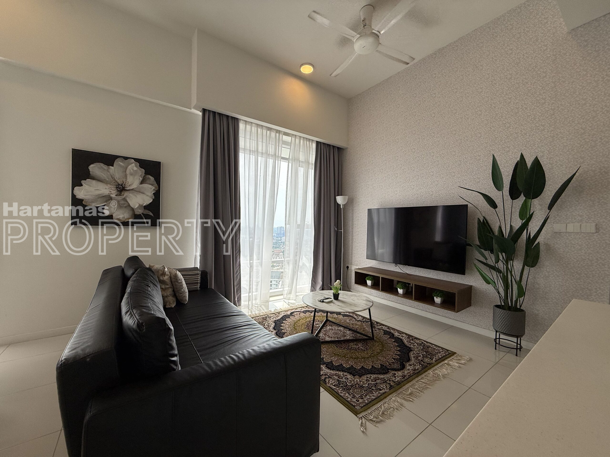 – Living Hall with Air-conditioning, lights, TV, TV cabinet, sofa set, coffee table, & curtain
